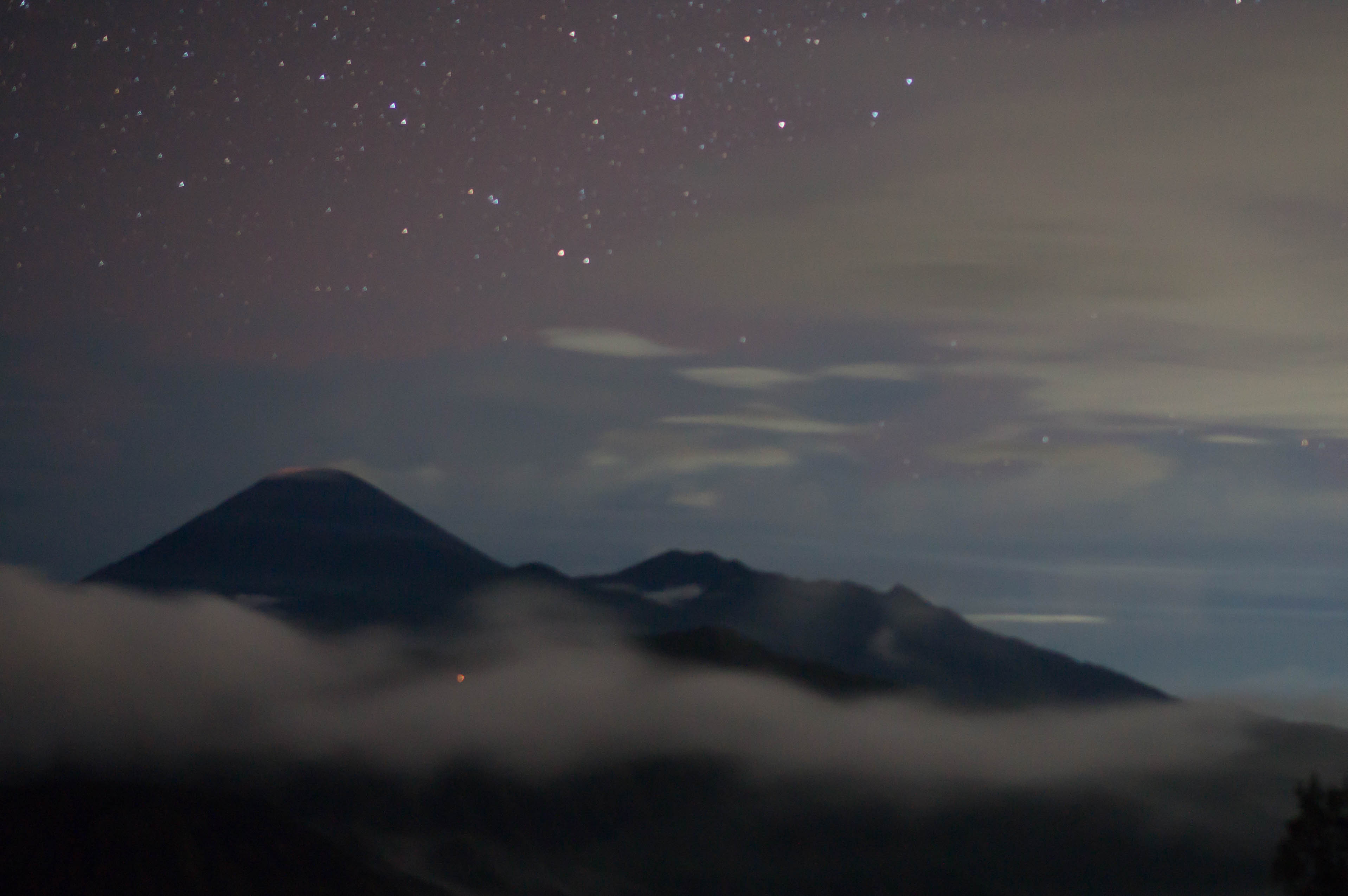 Three hours later we arrive at the Jeep pickup zone. A lovely hotel in the mountain just before Bromo. I take a moment to test out the tripod and long exposure settings and take a snap shot of the stars.